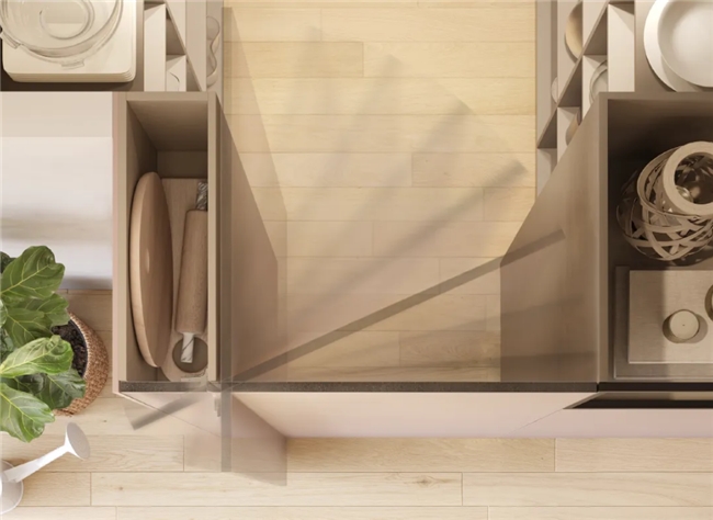 在实际应用中,比如厨房场景,能够最终靠反向安装向内开启的CLIP top BLUMOTION可利调®阻尼铰链,来创造一个隐藏的空间,将其作为食品、厨具储藏室使用。此外,在家具门后面还可以设计一个隐藏的置物架,用于存放较小的物品。