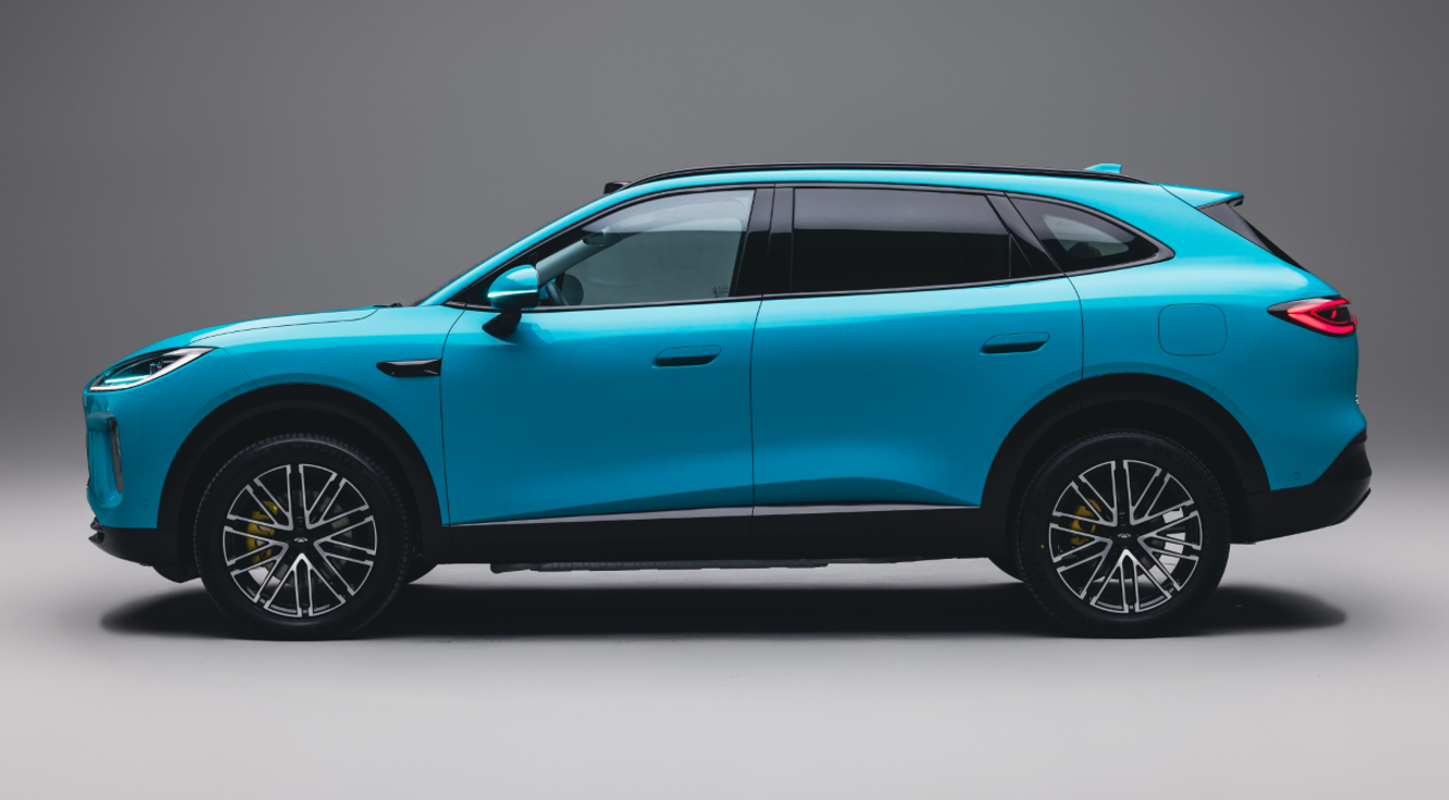 车身侧面的设计同样可圈可点,半隐藏式门把手兼顾了使用可靠性与科技感,无边框后视镜则有效扩大了驾驶视野。全车摒弃传统亮条,采用熏黑处理,搭配19英寸轮毂与黄色卡钳,运动氛围直接拉满,流畅的尾窗线条更勾勒出浓郁的豪华质感,让侧面姿态兼具动感与优雅。